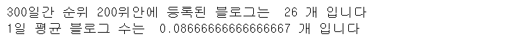 print('300일간 순위 200위안에 등록된 블로그는 ', str(blog_cnt), '개 입니다')